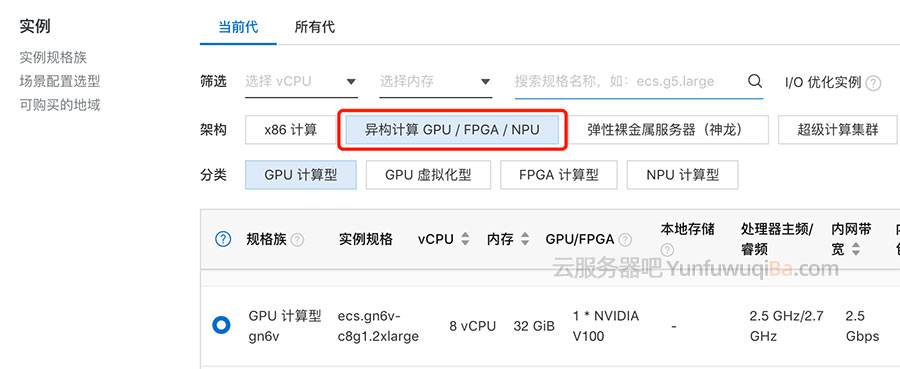阿里云GPU服务器如何选购呢?打开阿里云GPU服务器购买页面,架构选择“异构计算 GPU / FPGA / NPU”,分类选择“GPU服务器”如下图所示: