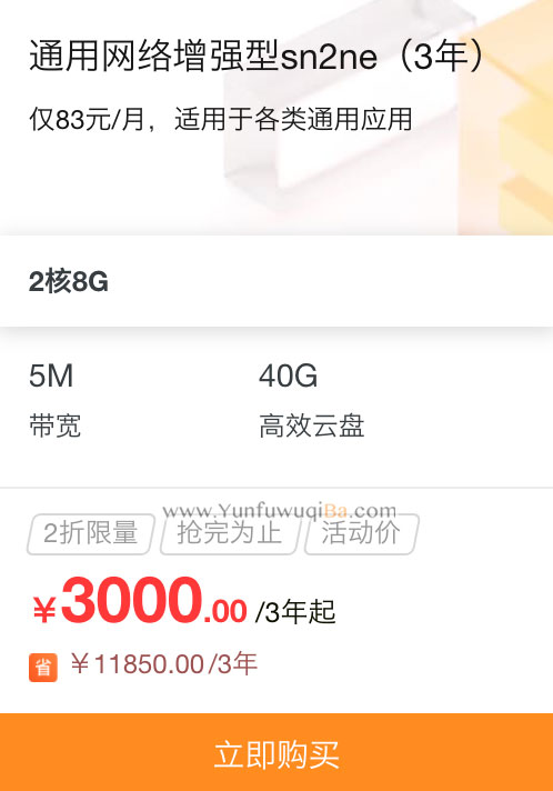 阿里云通用网络增强型sn2ne云服务器,配置为2核/8G/5M公网宽带,优惠价3年10000元,折合83元/月,适用于各类通用应用,云服务器吧分享: