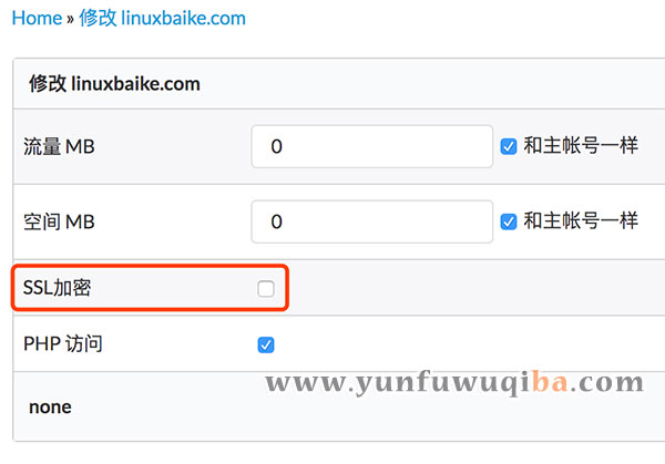 2、将“SSL加密”取消即可,不要勾选,就这么简单,就取消了HTTPS;